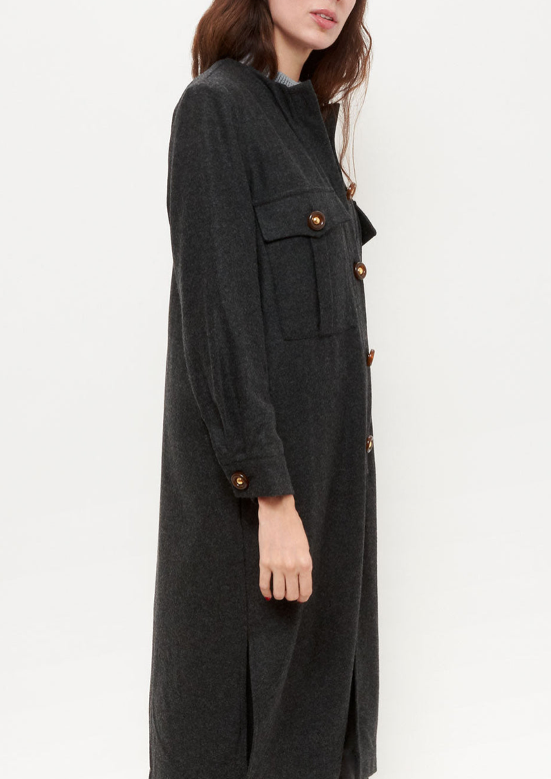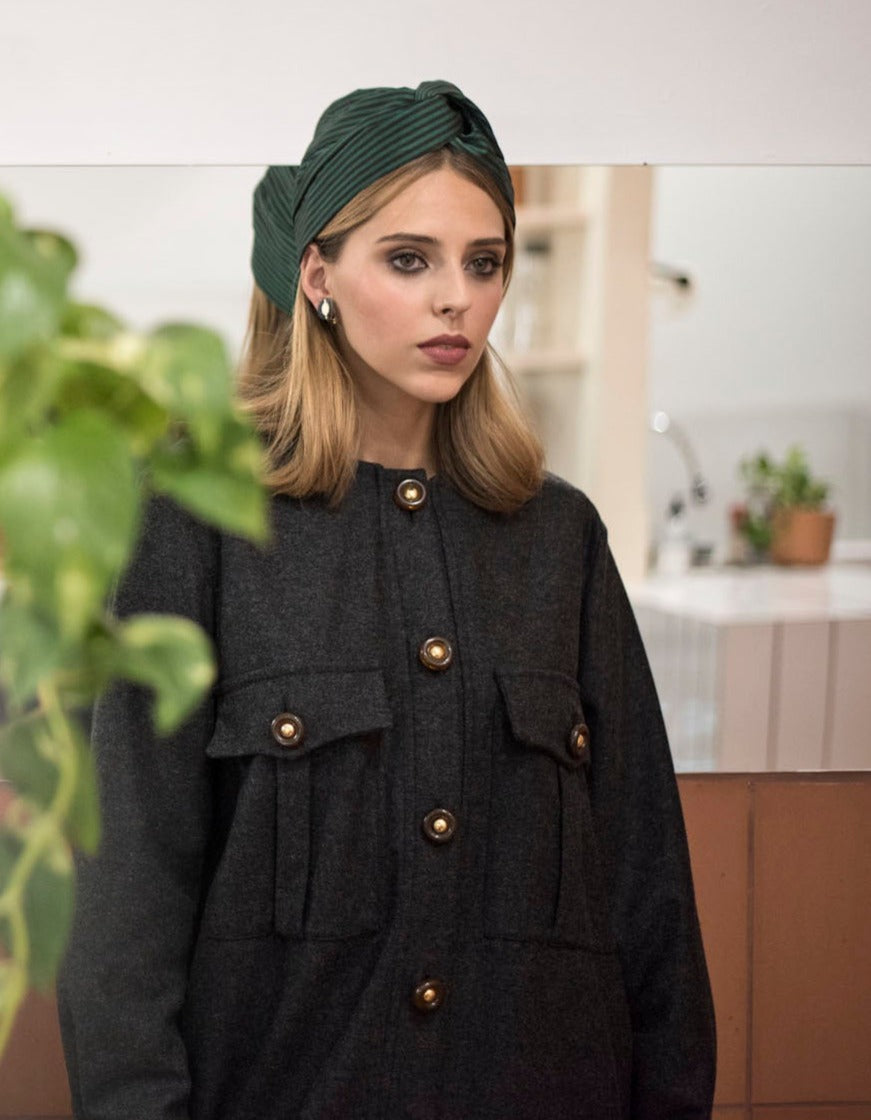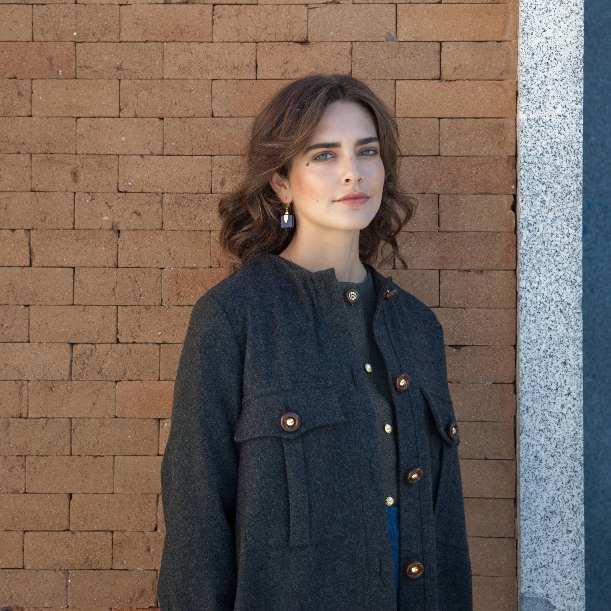 Milicia coat made with 30% blue and beige marbled wool, buttons* from Death Stock and handmade vegetable silk and organic dye ribbons from traditional Moroccan craftsmanship.