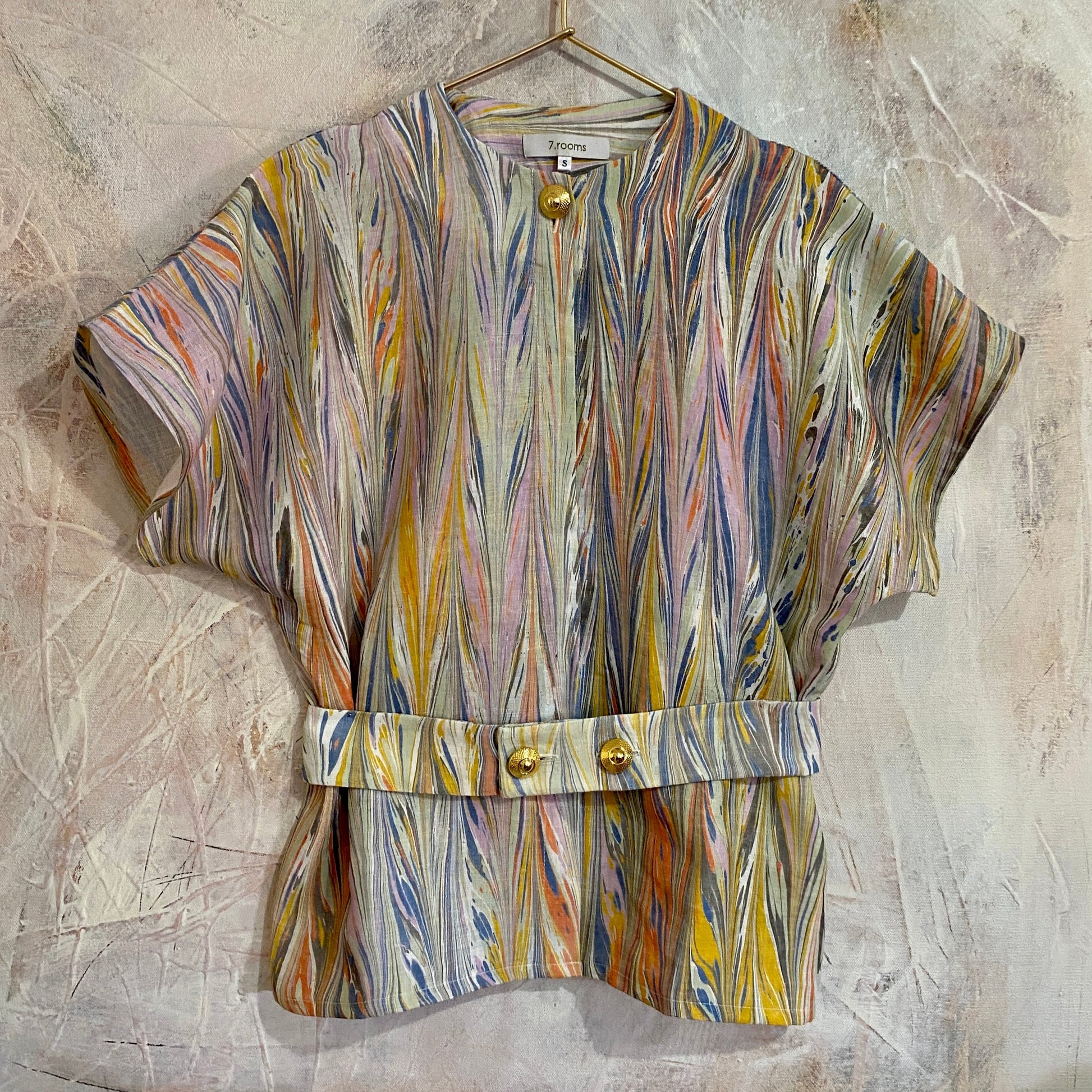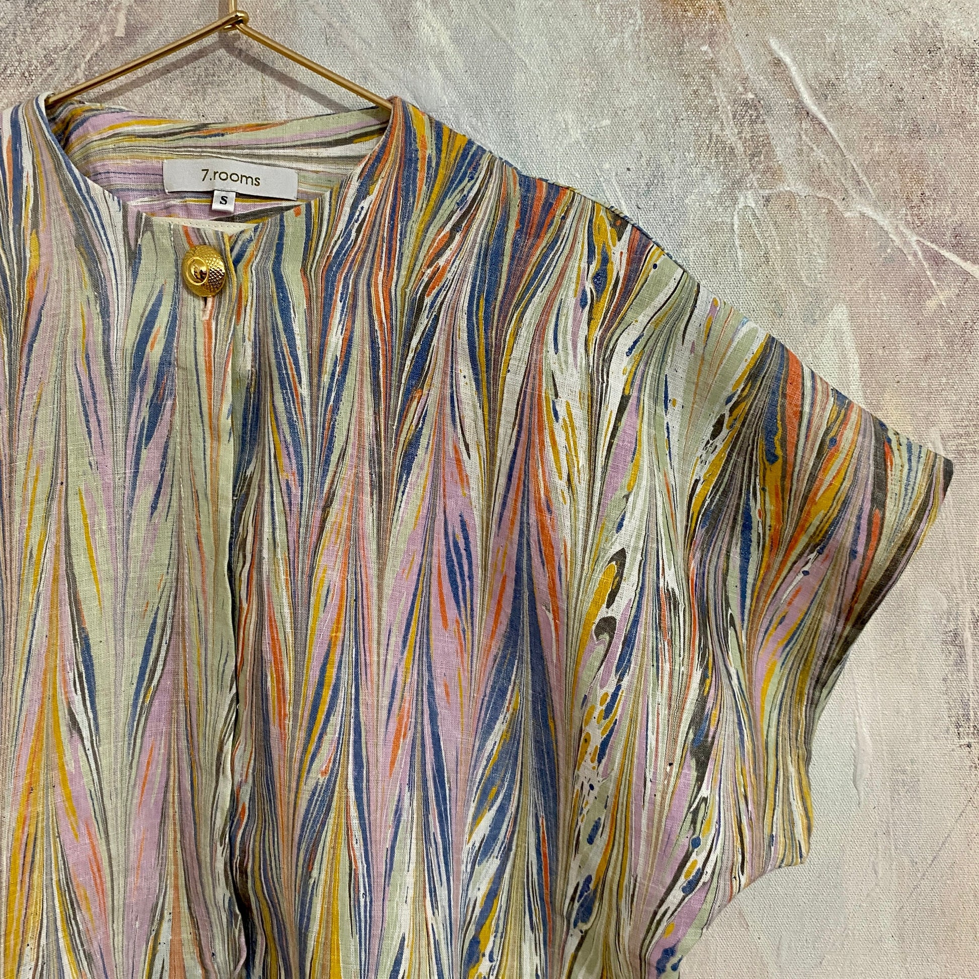 Our garments have a loose and straight cut pattern, they are loose fitting garments. From 7.ROOMS we only work with two sizes between S, which includes a 36-38, and M, which includes a 40-42.