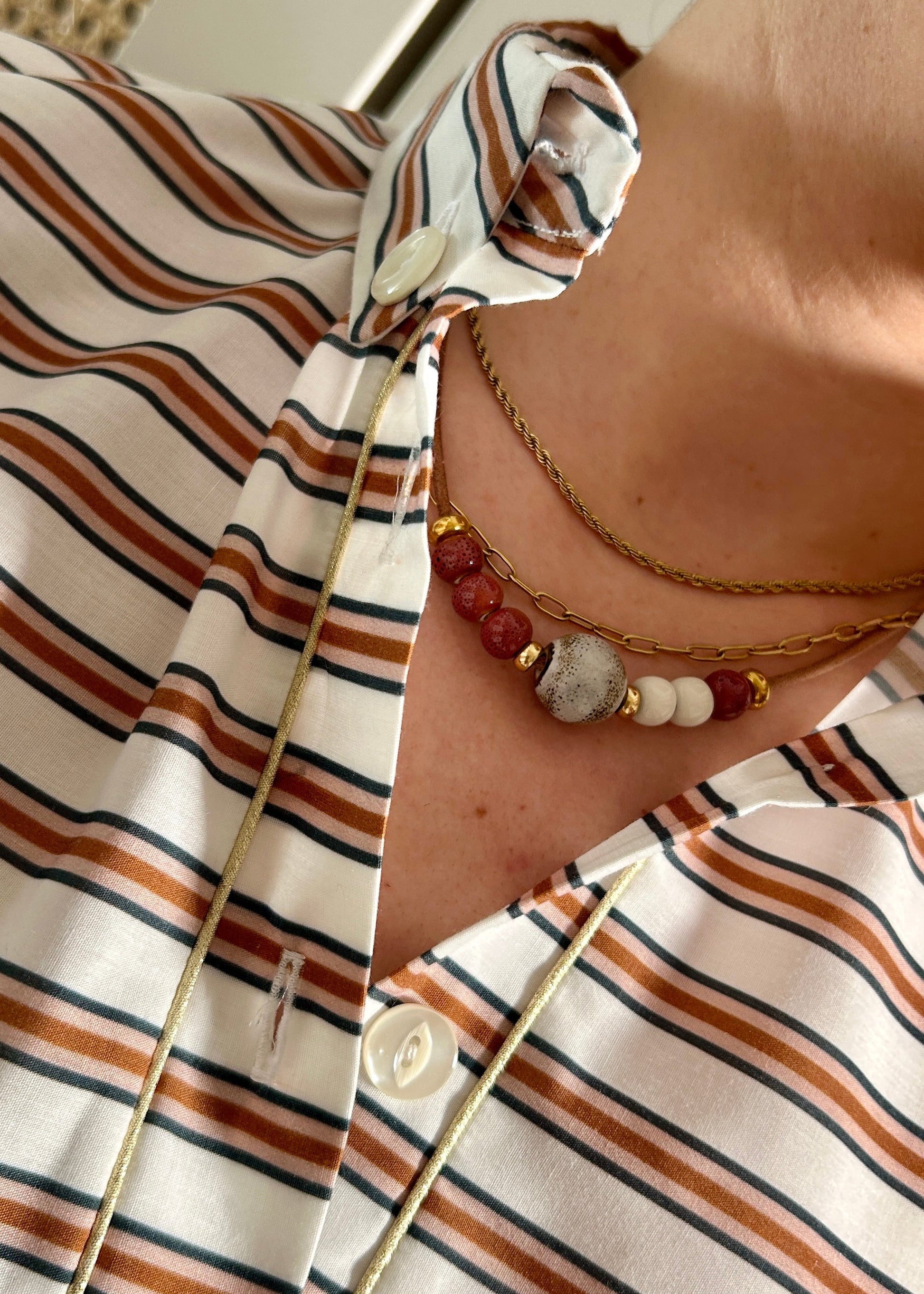 Nota: Algunos collares se han alargado para la campaña, es posible que el que recibas sea más corto que el que ves en las fotos. Si necesitas alargarlos, te podemos dar algunos trucos de estilismo.