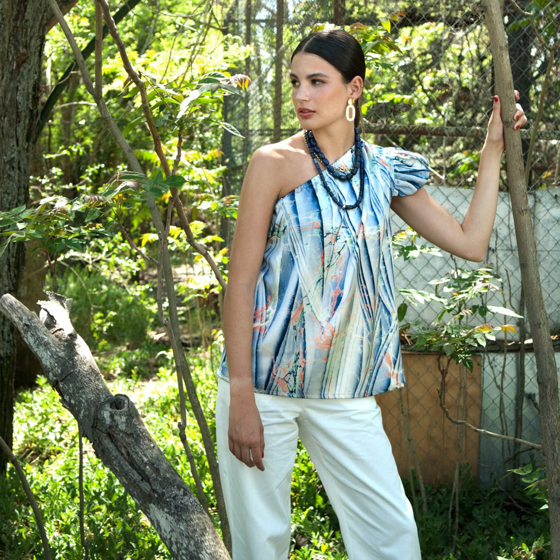 The romantic bet of the season. Blouse with puffed sleeves and a tie with ribbons and antique buttons*. Ideal with jeans, high-waist pants or a flared skirt. Made in 100% cotton.