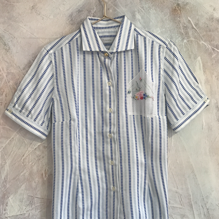 La apuesta romántica de la temporada. Blusa camisera entallada, bolsillo bordado mano y botones* antiguos. Ideal tanto con unos jeans como con un pantalón de tiro alto o una falda evasé. Confeccionada en algodón 100%.