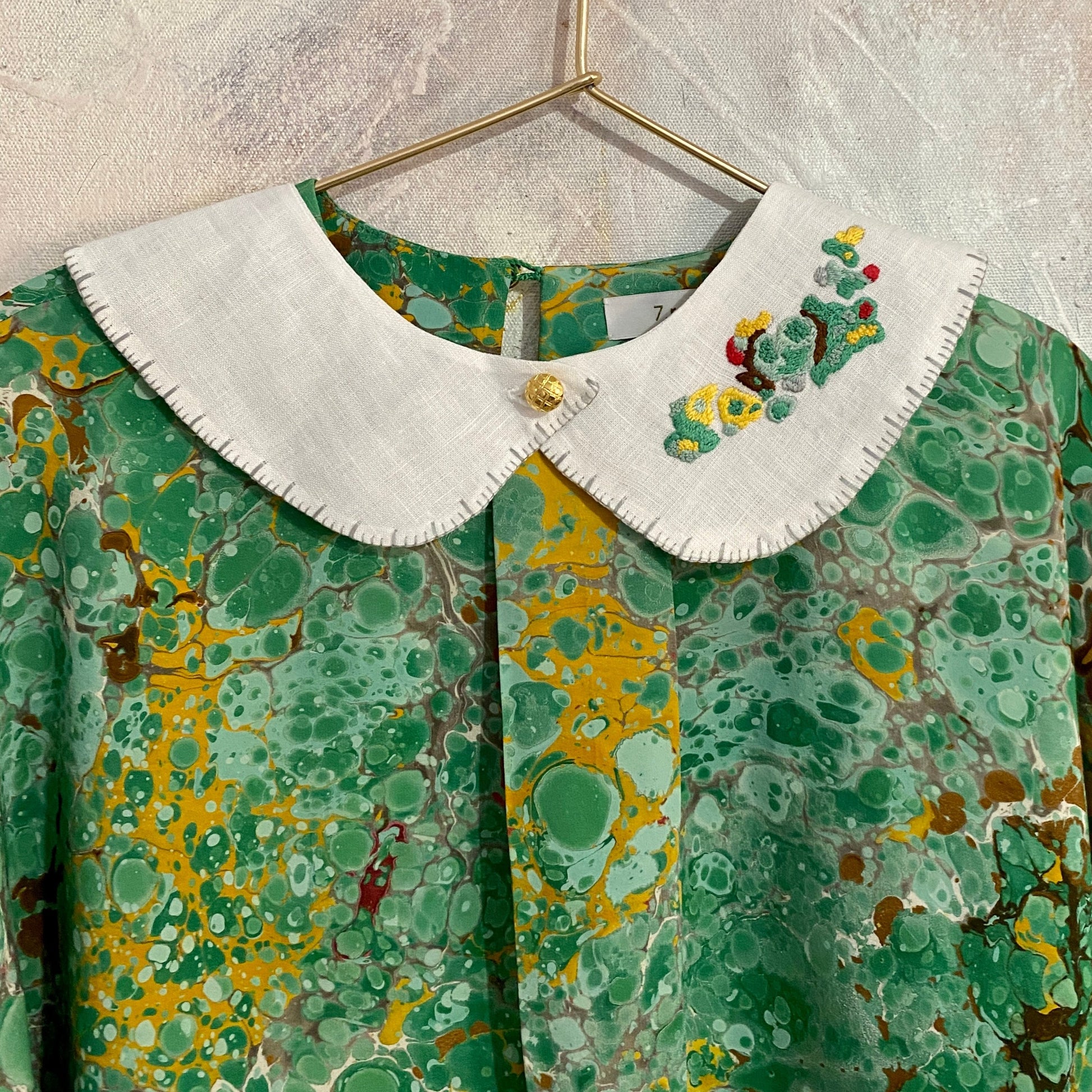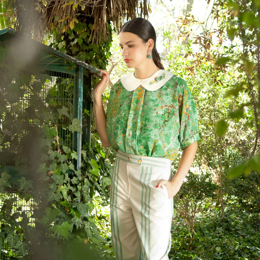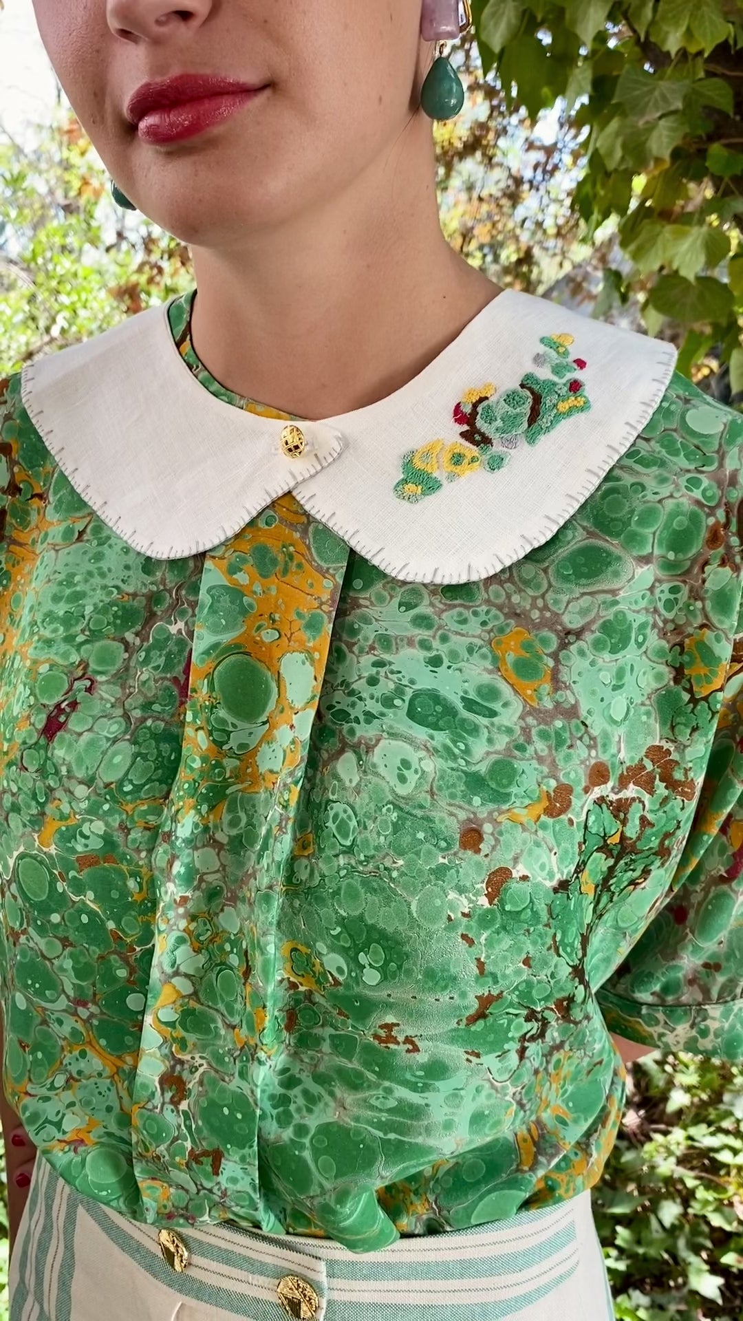 Blusa confeccionada con tejido estampado a mano uno a uno con la Técnica del marmoleado Veneciano por ARTESANOS en (Trieste) Italia.