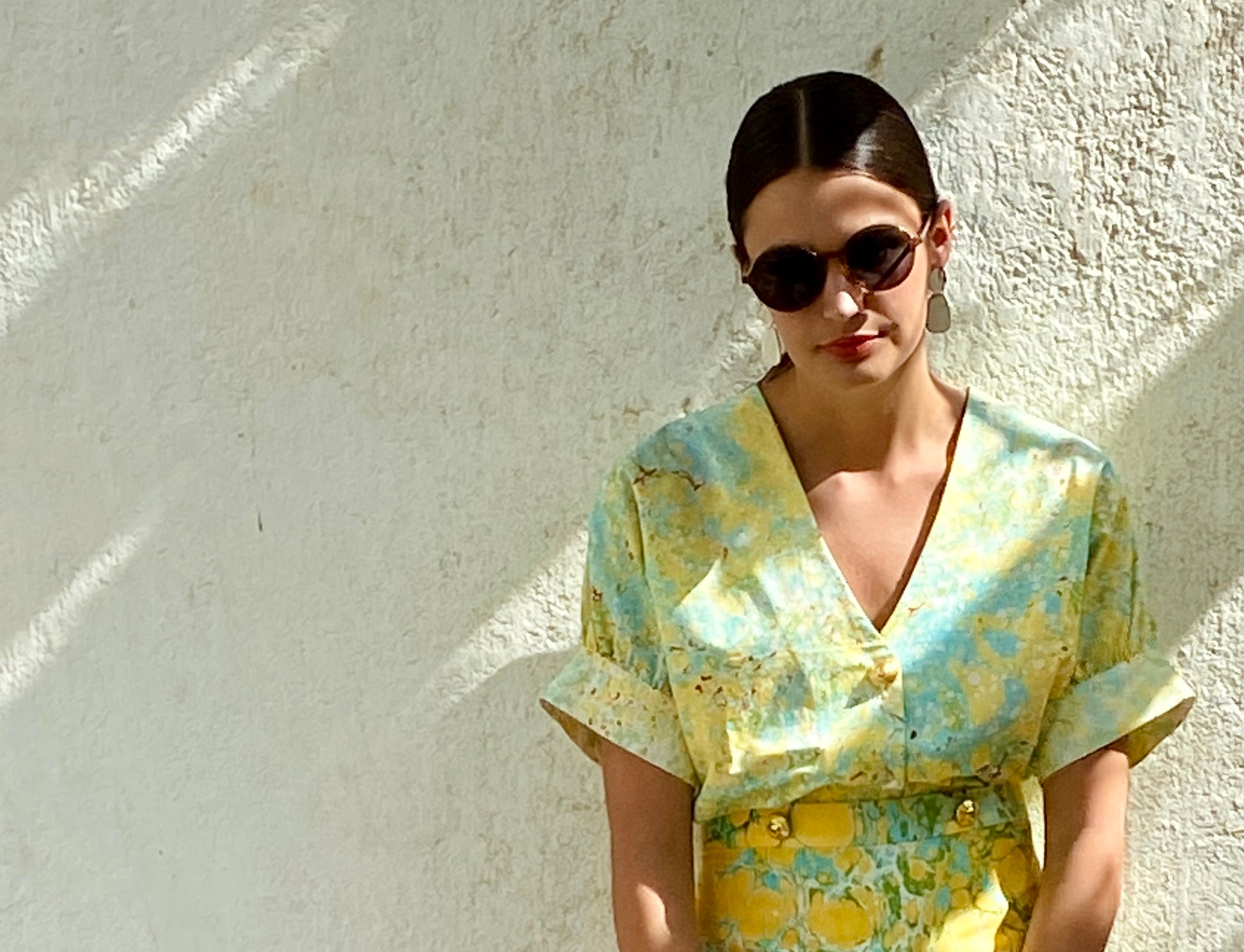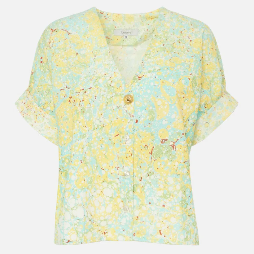 Blusa confeccionada con tejido estampado a mano uno a uno con la Técnica del marmoleado Veneciano por ARTESANOS en Italia.