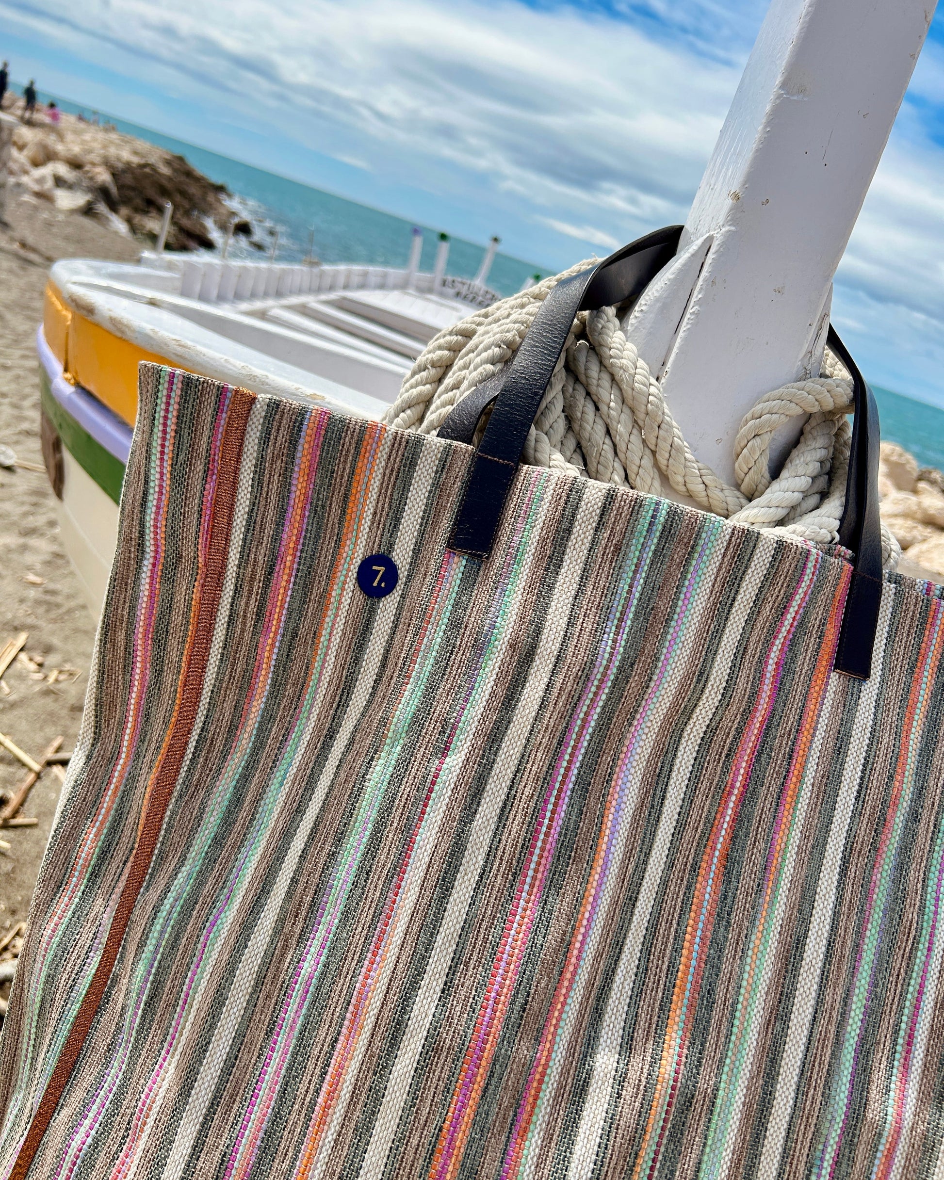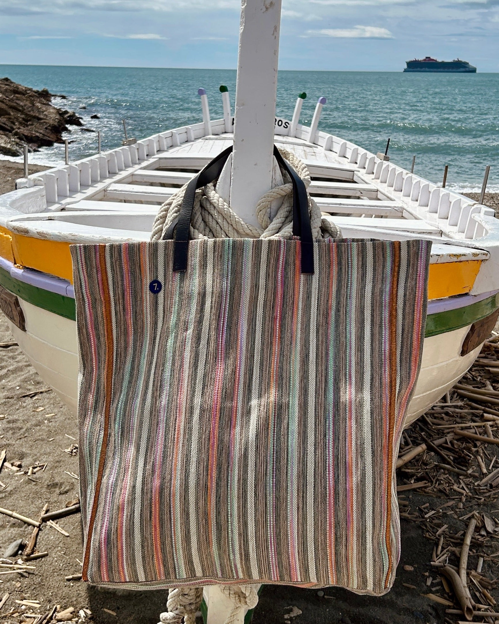 Nuestros bolsos están confeccionados en tela de poliester 100% reciclado forrado de algodón con asas de PIEL marrón