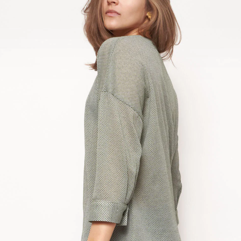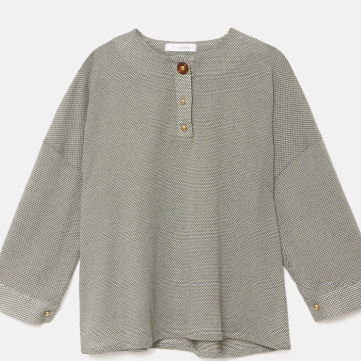Nuestra apuesta de primavera por el punto reciclado certificado, tejido con algodón recuperado o regenerado. Cuello redondo con botones procedentes de stocks antiguos, manga caída con puño y corte recto. El fit es oversize y da talla.