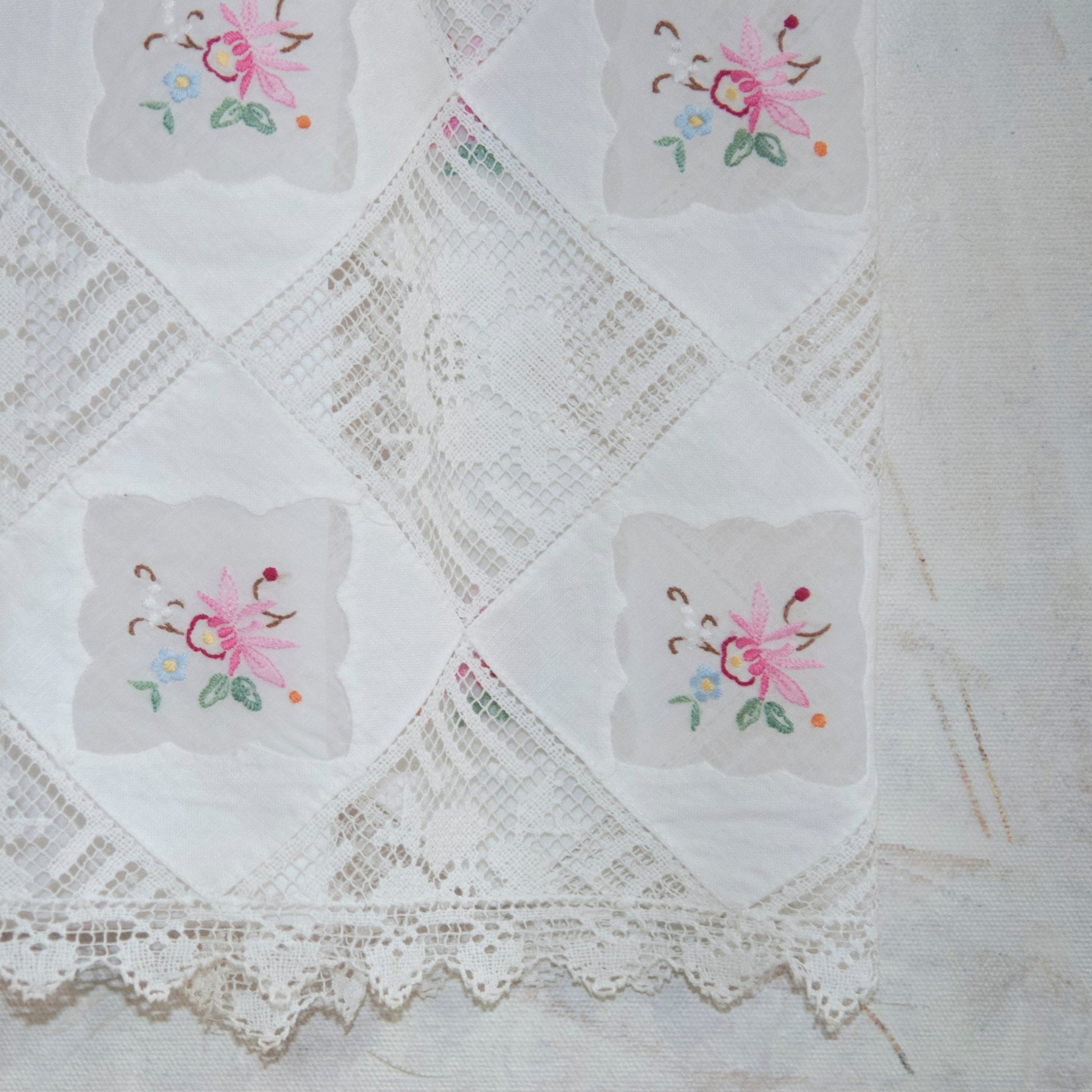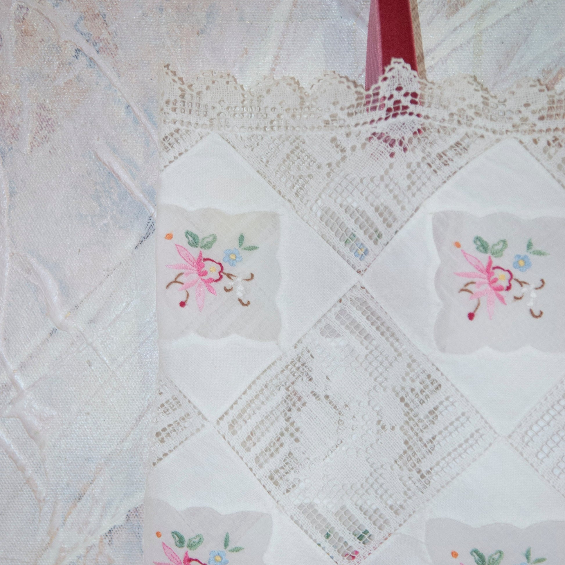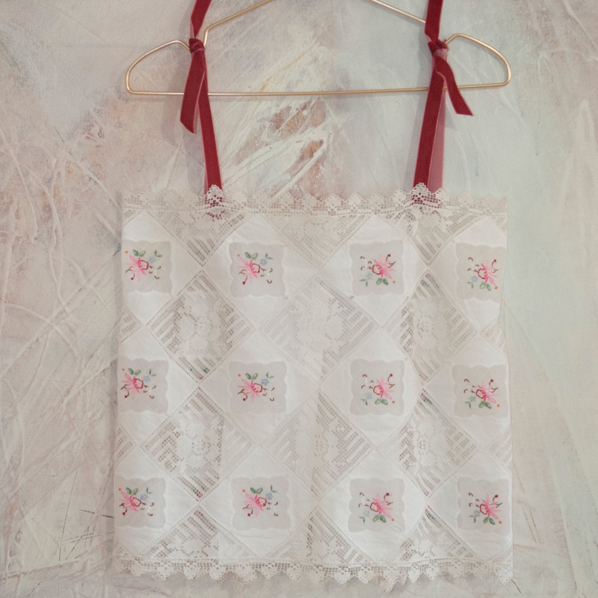 Este top súper especial está confeccionado con antiguas piezas de mantelerías bordadas a mano y tirantes de terciopelo, abotonado por detrás con pieza de algodón orgánico.